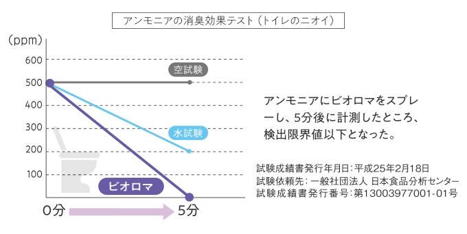 臭気の強いお手洗いのアンモニア濃度は9ppm程度。それよりも高い数値(500ppm)にBio.Romaをスプレーしたところ、5分後にはほぼ0ppmに。また、70ppmのトリメチルアミン(鮮度が落ちた魚のような臭い)も、5分後にはほぼ0ppmまで数値が落ちました。