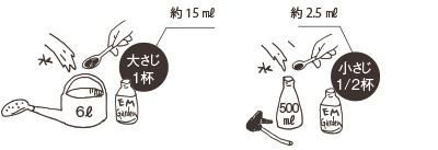 6Lのジョウロの場合、大さじ約1杯(15ml)、500mlのスプレーヤーの場合、小さじ1/2程度を目安にしてください。